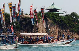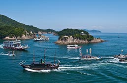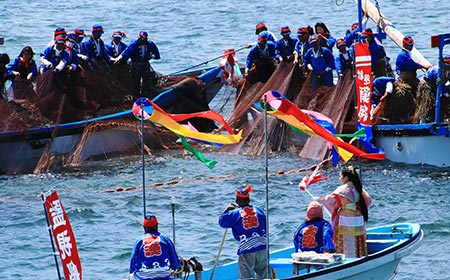 鞆の浦の初夏の風物詩「観光鯛網」。この漁は鞆の浦に約380年もの長きにわたって伝わる伝統漁法です。樽太鼓と大漁節が浜に響く中、古式に網をしぼり産卵に来る魚群を一気に捕まえます。見学者は船の上からその様子を見学することができます。参加には事前に観覧料としてチケットの購入が必要です。バス券がついたもの、家族観覧券など、数種類あるのでそれぞれに応じて選びましょう。鯛網は仙酔島の浜で大漁祈願の乙姫の舞からスタートします。その後、観覧船とともに沖合へ出航し、網を海中100mへおろした後、掛け声をかけながら網を小さくしていきます。引き上げ後は、その場でとれたての桜鯛を購入することが可能です。その他に特典として、下船後に「鞆の浦史跡巡り無料ツアー」にて鞆の浦観光を堪能できます。