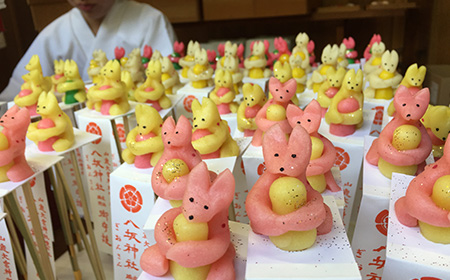 毎年6月15日に八坂神社(大宮神社境内)で開催され、米の粉で形どられた「犬子ひょうたん」と呼ばれるお守りが販売されます。山鹿の人びとはこれを部屋の隅に飾り、この1年間の無病息災を祈ります。このお守りは手作りのため表情が異なり、どれにしようか迷ってしまいそうです。お祭りのはじまりは、江戸末期。疫病が流行り出し困っていた頃、衹園の神が枕元に立ち、「現在の祠(ほこら)を小高い地へ場所を移すように」と告げられました。そこで、八坂神社を移そうとしたところ、どこからともなく現れた子犬が神輿(みこし)に付いて離れずにおり、その後消えてしまいました。すると疫病は消滅し、里人たちは「あの子犬は、衹園さんの使いものに違いない」といい、子犬の姿を、衹園さんの好きな酒を入れる「ひょうたん」とともに作りはじめました。またこの日は「初かたびら」と呼ばれ、浴衣を着始める風習があります。ぜひ、かわいい犬子ひょうたんをお求めに出かけてみてはいかがでしょうか。