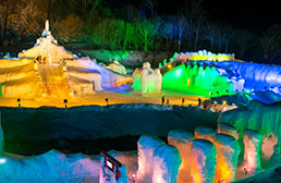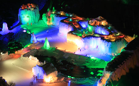 北海道でも有名な温泉地、層雲峡温泉で行われる氷瀑まつり。11月上旬から約3ヶ月かけて、自然の寒さを生かして作られた大小約30基の氷の造形物は迫力満点です。昼間は、日光で青く輝き、夜には7色にライトアップされ、神秘的な雰囲気に包まれます。巨大な氷像や、氷の滑り台など、冬ならではの楽しみが盛りだくさん!夜は花火打上げなどのイベントもあります。氷瀑まつり期間中、層雲峡温泉宿泊者限定の札幌からのバスプラン(※要予約)などもあるので、宿泊と観光を合わせて楽しむのもおすすめです。そして、真冬の北海道は想像以上に寒いです。野外のイベントですので、マフラーや手袋はもちろん、使い捨てカイロやヒートテック衣類など完全防寒スタイルで冬の北海道を楽しんでください。