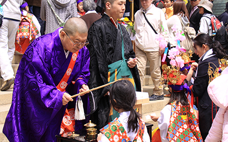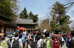 東京の西側、八王子市内に位置する高尾山。首都圏エリアからアクセスも良く、登山やハイキングに年間約250万人が訪れます。春は様々な草木が芽吹くときです。その春に行われる「春季大祭」は髙尾山薬王院の主要祭事のひとつで、華やかな衣装を着飾った稚児を中心に、地元ボーイスカウトや、中学校吹奏楽部、髙尾山修験道山伏、僧侶、大導師など約500人もが大行列となって十一丁目茶屋より大本堂までの参道までを練り歩きます。春らしくにぎやかな行列は見物客や登山客に大人気です。練り歩きの他にも、獅子舞やはしご登りなど、日本らしい見せ物もあります。高尾山は途中までケーブルカーやリフトを使って登る方法と、はじめから徒歩で登る2つの方法があります。春の息吹を感じながら、山に登ってみるのはいかがでしょうか。