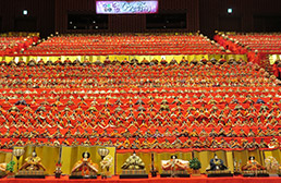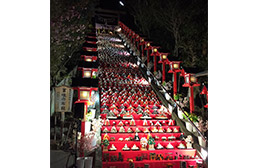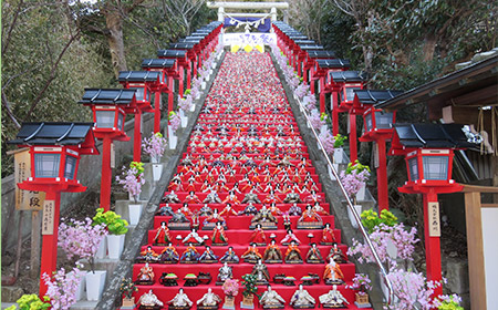 このひな祭りは、徳島県勝浦町で開催されている『ビッグひな祭り』を東西の勝浦で開こうと企画され、勝浦町から約7,000体の人形を譲り受けて始まりました。総数約30,000体のひな人形やぼんぼり、花飾りが市内各会場に飾られ、街はひな祭り一色に彩られます。遠見岬(とみさき)神社の60段の石段に飾られる約1,800体のひな人形は、昼間は華やかに、そして夕暮れ時からはライトアップされ、幻想的な雰囲気になります。勝浦市芸術文化交流センターKüsteでは、日本最大級の享保風雛(きょうほふうびな)15体を中心に、施設全体で約8,000体のひな人形が飾られます。稚児衣装を纏った子どもたちによるひな行列やパレード、歩行者天国の各種出店なども催されます。勝浦の街を散策しながら美しいひな人形をご鑑賞ください。