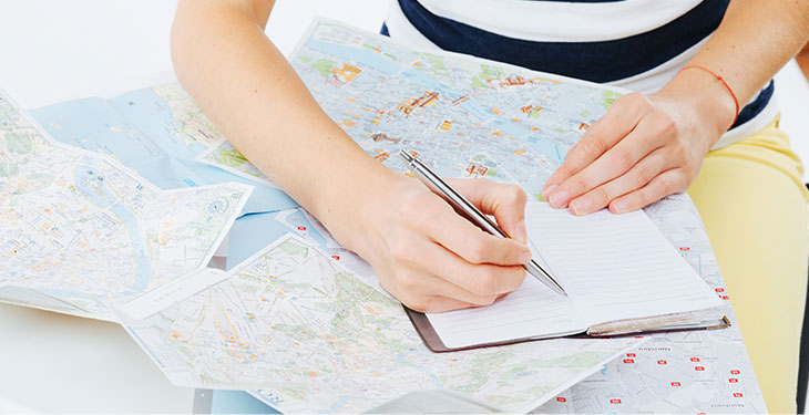 慣れていないときは、地図が手元にあると便利です。自宅や最寄り駅、集合/解散場所を出発点、終着点と考えましょう。その先は、行く地域の中で、さらに気になるポイントをひたすらピックアップ!ここで、ルートを考えながら取捨選択してしまうと、時間がかかるので一旦行きたいところをひたすら上げましょう。ある程度たまったら、グーグルマップやYahoo乗換検索などを使い、点と点を線でつなげます。地図や、乗換検索などの便利ツールはどんどん使っていきましょう。地味な作業ですが、これを行うことによって旅先で迷うことがだいぶ減ります。この作業のなかで、行けるところ・時間的に行けないところを分け、ルートを一本化していきましょう。