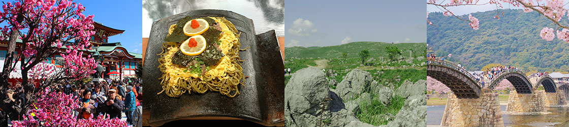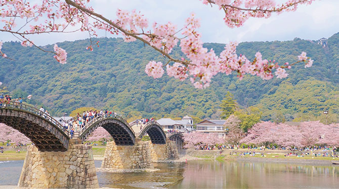 1673年に当時の岩国藩主によって作られた5連アーチからなる全長約200mの木造橋です。276年間建て替えを繰り返し、その姿を保っていましたが、1950年に台風により崩壊、その後再建され、現在の姿となりました。構造形式が世界的にも珍しく、日本三大名橋・日本三大奇橋に数えられています。桜の名所とも知られていて、春には大勢の観光客で賑わいます。
