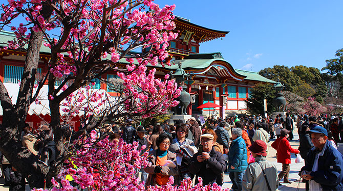 防府天満宮は、日本の三大天神のひとつであり、学問の神様として有名な菅原道真を初めて祀った日本で最初の天満宮としても有名です。春になると境内にある16種1,100本の梅が咲き誇り、多くの観光客が訪れます。参道には土産物店等が立ち並びます。階段を登った先にある朱塗りの楼門が印象的です。高台に建っているので、眺めも良いです。