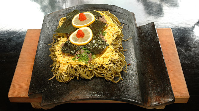熱した瓦の上に載った茶そばと具材を温かいめんつゆで食べる、山口のご当地グルメです。明治時代に瓦を使って肉などを焼いた話を参考に作られました。熱々の瓦に載った状態で提供されるので、麺のもちもちとした食感と、瓦で焼かれたおこげのパリパリ感、2つの食感が楽しめます。