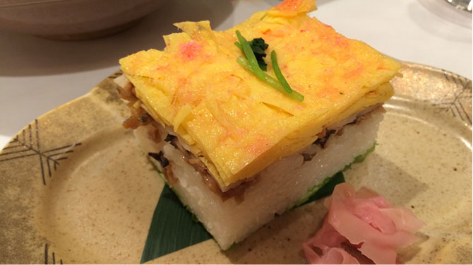すし飯、椎茸、錦糸卵、青菜、名産である蓮根などを何層にも重ね、サンドイッチ上にした後に重石で押し固めて作られます。一度に大きいものを作り、1人前ずつ切り出します。ハレの日などによく登場する岩国の郷土料理です。今から380年前に合戦に備えた保存食としてつくられたのが起源とされています。
