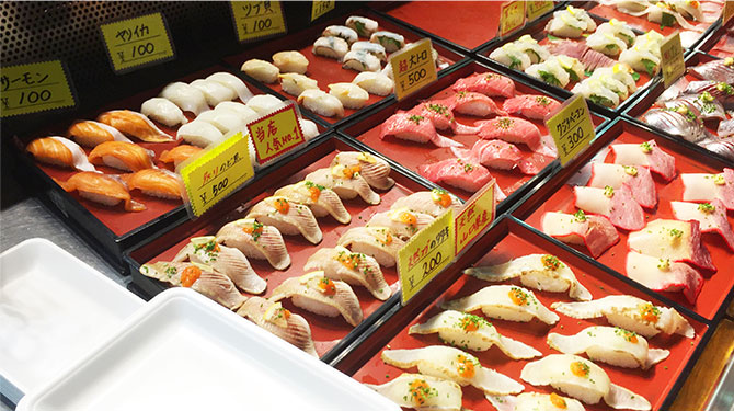 下関に着いたら、関門の台所と呼ばれる唐戸市場でお寿司を食べよう。金・土・日・祝のみに開催される「活きいき馬関街」へ行けば、その日に釣り上げられた魚が市場に並ぶので、新鮮で美味しいお魚が楽しめます。唐戸市場でお寿司を購入するには、まずは最初に2貫をトレーに載せてもらいお会計をします。別のお店で美味しいお寿司を見つけたら、そのトレーにまたお寿司を載せ、会計してもらいましょう。それぞれのお店に得意な魚がありますので、食べくらべをしてみるのもおすすめ。