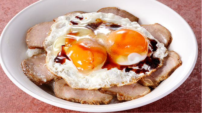 その歴史は約50年前。当時今治市にあった「五番閣」という中華料理店のまかない料理として誕生しました。ご飯にチャーシュー、半熟目玉焼きをのせ、焼豚の煮汁をかけるだけのシンプルなメニューです。侮ることなかれ、現在ではB−1グランプリでも10大会連続入賞の猛者なのです!今治に来たなら、この「焼豚玉子飯」を味わうことなく帰れません!!!