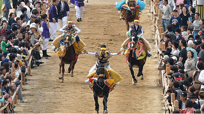 お供馬の走り込み(菊間祭り)は愛媛県今治市加茂神社で行われる祭事で、その起源は500年前ともいわれています。祭用の鞍や装飾具をつけた馬に、3歳から15歳までの少年がまたがり、勇ましいかけ声と共に約300mの参道を一気に駆け抜けます。馬との距離感も近く、間近で迫力ある走りを体感することができます。また、お供馬のほか、獅子舞や神輿や牛鬼などが境内に繰り出し、祭りの雰囲気を盛り上げます。