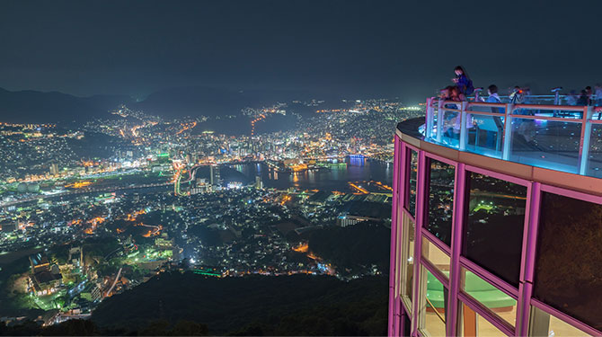 モナコ、香港とともに世界新3大夜景のひとつに選ばれた夜景は圧巻!展望台からは、ライトアップされた長崎市内を一望できます。自分が今まで観光してきた場所を探してみると面白いかも!山の上なので、かなり寒いです。しっかりと防寒した状態で、長崎の夜景を堪能しましょう。中腹駅の無料駐車場の他に、山頂駐車場があります。土日や連休などは、自家用車の利用制限があります。該当する日に行かれる方はご注意ください。車のほかに、麓からロープウェーに乗って、展望台に向かう事もできます。
