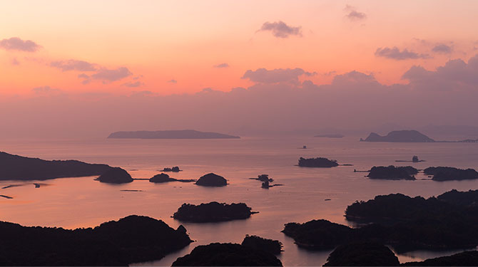 旅のはじまりに、美しい九十九島の石岳展望台の夕日を見よう。
