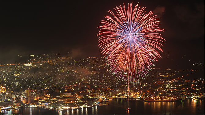 港町 長崎の発展を願い毎年開催されているながさきみなとまつりは、2日間で31万人が集まり、約1万発の花火が打ち上げられます。花火の他にも数々のステージイベントに、パレードや屋台グルメなど盛りだくさんで、街全体が賑わう2日間となっております。特に長崎の美しい夜景と花火を一緒に見ることができる貴重な機会ですので、見逃さないようにしましょう!