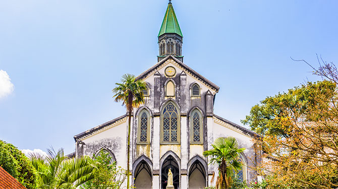 開国初期に、在留外国人のために建てられた、現存する日本最古の木造教会。ステンドグラスをふんだんに使用したゴシック様式の造りは、洋風建築輸入の始まりともされています。また、1933年に国宝となりましたが、原爆による損傷の修復が完了後、現存する日本最古の教会建築として、再度1953年に国宝に指定されました。さらに、2018年にユネスコの世界文化遺産に登録された「長崎と天草地方の潜伏キリシタン関連遺産」の構成資産のひとつです。天主堂の横には長崎港や東山手を一望できる祈念坂があります。