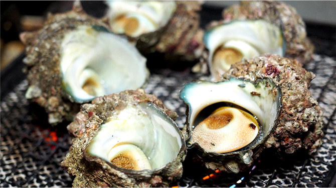 波戸岬に立ち寄ると、醤油の香ばしい香りがどこからともなく漂ってきます。長屋風の雰囲気のある建物に、十数店舗のサザエの壺焼き売店が隣り合いながら並んでいます。店内にはカウンターがずらりと並び、さざえ、イカ、アワビや季節によっては牡蠣など新鮮なシーフードがいただけます。味付けはタレか塩が選べるので迷ってしまいますが、店によって味の違う絶妙なタレに人気があります。カウンター越しに新鮮なサザエがじゅうじゅうと音を立てて焼きあがる様子を眺めながら、タレや塩、柚子七味、マヨネーズなどをトッピングしてお召し上がりください。