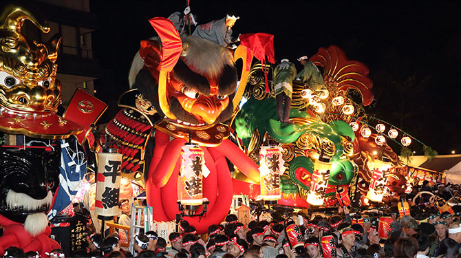 『唐津くんち』は唐津神社の秋の例大祭(秋季例大祭)で、毎年11月2日〜4日にかけて開催されます。11月2日は19時30分頃より宵曳山(よいやま)が催されます。11月3日の御旅所神幸(おたびしょしんこう)の準備のため、火矢を合図に1番曳山赤獅子を先頭にそれぞれの曳山が各町内から巡行に加わり、最後に唐津神社前に勢ぞろいします。14台ある曳山(ひきやま)はどれも形が異なり、獅子や兜、亀や鯛などの形をしていて、和紙や漆、金箔などで仕上げられた世界最大級の乾漆造の美術工芸品です。堤灯に照らされて浮かび上がる曳山の姿は、昼間とは違った神秘的な雰囲気を感じられるため必見です!