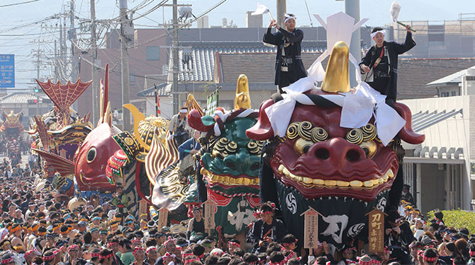 『唐津くんち』は11月3日に行われる御旅所神幸でクライマックスを迎えます。西の浜での曳込みでは2トン以上もの曳山の車輪が砂地に埋もれてもものともせず、曳子たちの勇敢な姿と掛け声が最高潮に達します。曳子達の『エンヤ、エンヤ』『ヨイサ、ヨイサ』の掛け声とともに威勢良く唐津市内の旧城下町を巡行する様を、ぜひ間近でご覧ください。