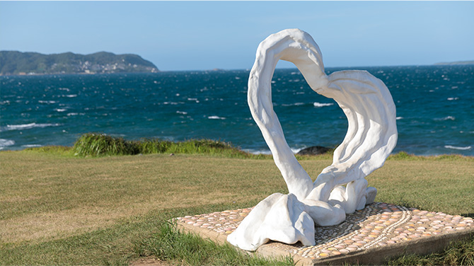 波戸岬は名護屋浦と串浦の間にある東松浦半島から突き出た小さな岬で、周辺には海水浴場などもあり海が間近に広がります。波戸(はど)とハートの語呂合わせから『ハート岬』と呼ばれ、『結ぶ』『包む』という意味が込められた真っ白なハート型のモニュメントが設置されています。また、岬の北端には縁結びの神社、『岬神社』があります。玄界灘の絶景を背にハートのモニュメント前での記念撮影がおすすめです。