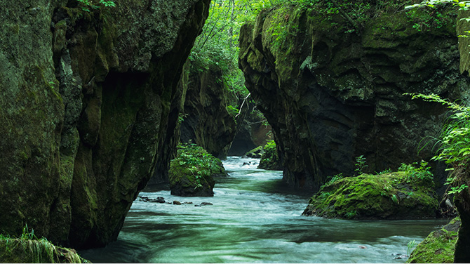 神秘的な空間の樽前ガローは自然景観が好きな方にはおすすめ景勝地の1つです。約6mの高さの崖の間に清流が流れ、岩肌には60種類以上の深緑の苔が絨毯のように張り付き、独特の景観を成しています。マイナスイオン溢れる絶好のフォトスポットです!