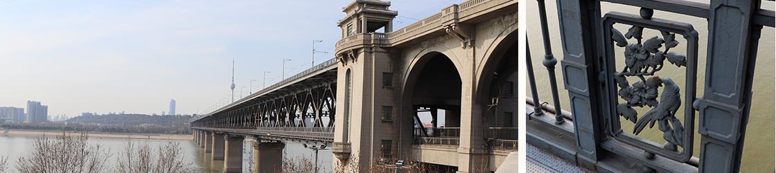 漢陽エリアと武昌エリアをまたぐ長江に架かっている巨大な鉄道道路併用橋。長江に初めて架けられた橋でもあります。全長は1670m、高さ80mあり、橋の上部は道路と歩道、下部に鉄道用の線路が敷かれています。欄干には、中国の民間伝説や、神話に基づく動物や植物が描かれており、歩きながら観察して楽しむことができます。川面までかなり高さがあるので、覗き込むのに勇気がいるかもしれません。