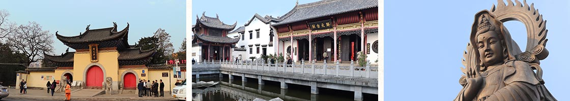 双面観音がシンボル。禅宗の仏教寺院です。中国のお正月・春節には参拝客が多く訪れます。観音以外にも、韋駄殿、大雄宝殿、蔵経閣、羅漢堂など様々な仏教施設があります。中でも羅漢堂は中国国内で最も有名な5ヶ所のうちの1つとされています。阿弥陀仏や千手観音、弥勒菩薩のまわりに五百羅漢が祀られており、各々番号が振られています。自分が好きな羅漢に自分の年齡を足した数字を出口付近にある引換所のようなところに伝えると、金色の御札のようなものを貰うことができます(有料)。